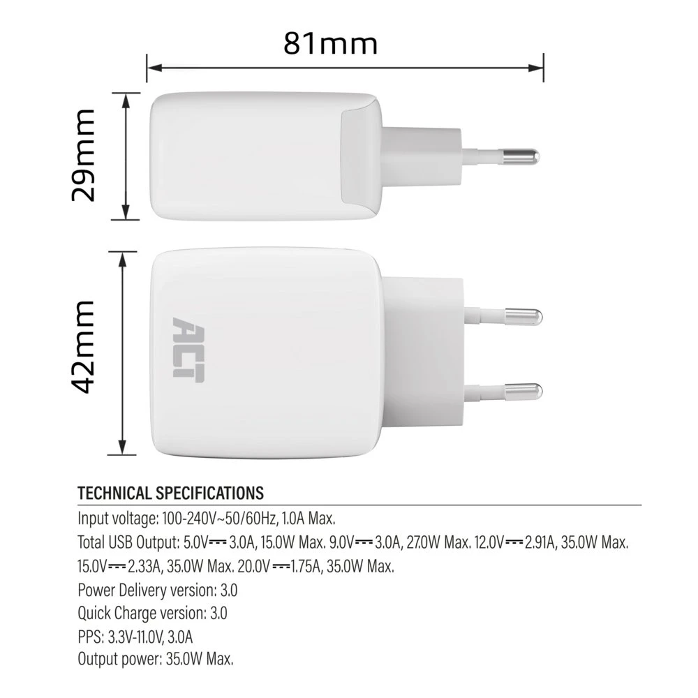 ACT AC2135 | USB-C Lader 35W | Power Delivery PPS & GaNFast