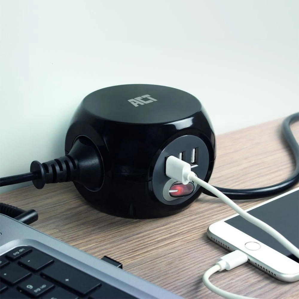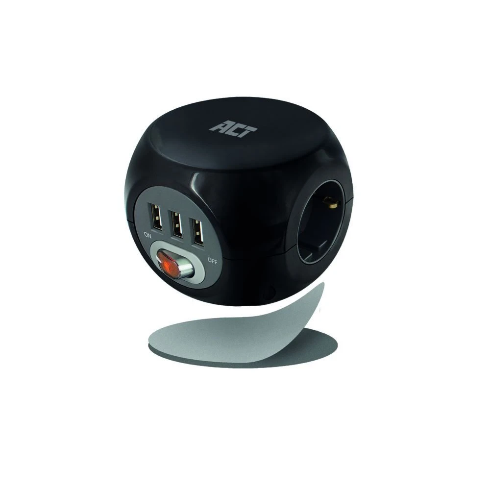De AC2400 is een kubusvormige stekkerdoos waarmee 3 elektrische apparaten en 3 USB-apparaten tegelijkertijd kunnen worden aangesloten. De USB-poorten samen leveren 2,4A en zijn uitgerust met bescherming tegen te hoge stroom en kortsluiting. De drie stopcontacten zijn uitgerust met kinderbeveiliging. Met de meegeleverde kleefpad blijft de kubus netjes op het bureau liggen. Zet alle stopcontacten en USB-poorten in één keer aan of uit met de lichtgevende aan/uit schakelaar.