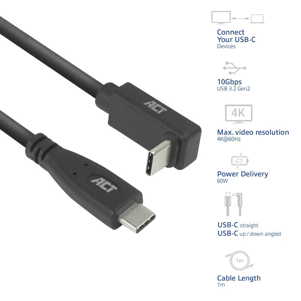 ACT AC7471 | USB 3.2 Gen 2 Kabel | USB-C (recht) naar USB-C (haaks boven/beneden) | 60W | 10Gbps | 1m | Zwart