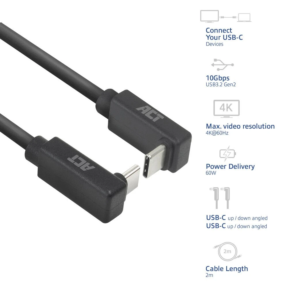 De USB 3.0 Type®C-kabel met haakse connector is een veelzijdige oplossing voor het aansluiten van USB-C-apparaten. Met een maximale overdrachtssnelheid van 10Gbps, is deze kabel ideaal voor toepassingen die een snelle en betrouwbare gegevensoverdracht vereisen. De kabel heeft twee 90° haakse connectoren (naar boven en beneden), die voor meer flexibiliteit zorgen in diverse situaties. Bovendien ondersteunt de kabel 60W Power Delivery en DisplayPort Alternate Mode met een maximale resolutie van 4K@60Hz.