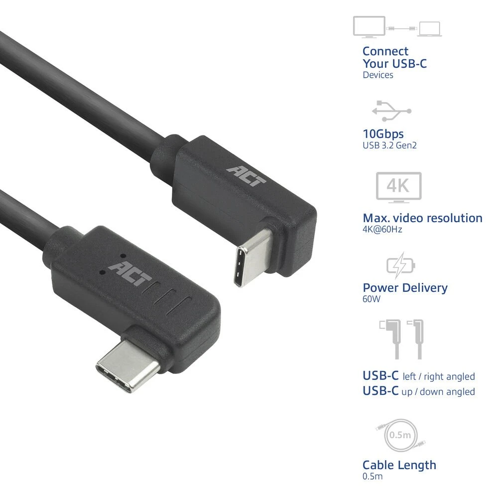 De USB 3.0 Type®C-kabel met haakse connectoren is een veelzijdige oplossing voor het aansluiten van USB-C-apparaten. Met een maximale overdrachtssnelheid van 10Gbps, is deze kabel ideaal voor toepassingen die een snelle en betrouwbare gegevensoverdracht vereisen. De kabel heeft zowel een 90° haakse (naar links en rechts) connector als een 90° haakse connector (naar boven en beneden), die voor meer flexibiliteit zorgen in diverse situaties. Bovendien ondersteunt de kabel 60W Power Delivery en DisplayPort Alternate Mode met een maximale resolutie van 4K@60Hz.