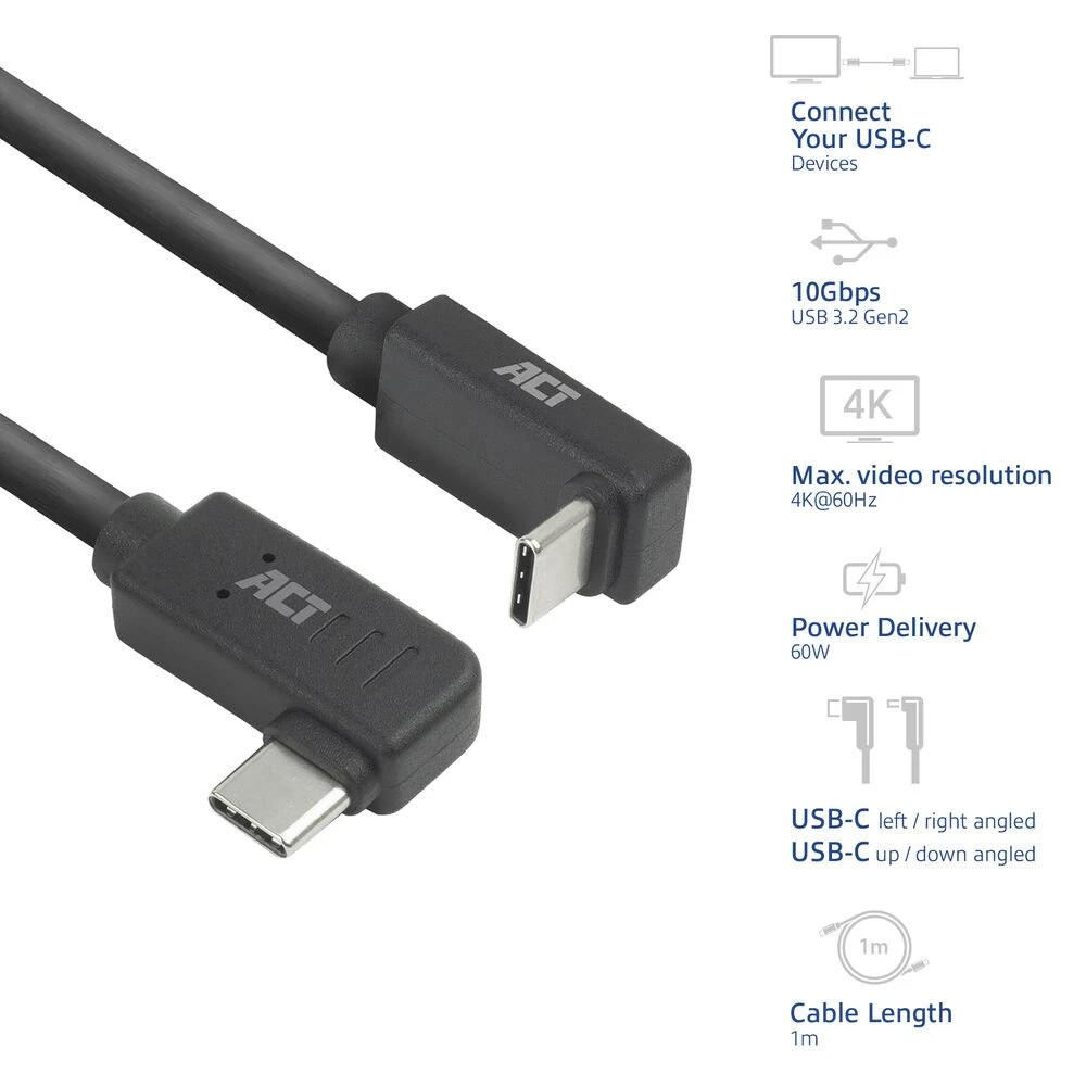 ACT AC7481 | USB 3.2 Gen 2 Kabel | USB-C (haaks links/rechts) naar USB-C (haaks boven/beneden) | 60W | 10Gbps | 1m | Zwart