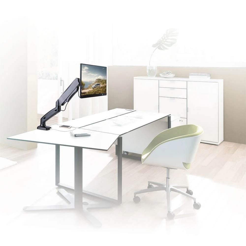 Creëer een ergonomische en ruimtebesparende werkplek door gebruik te maken van de volledig metalen AC8311 Monitorsteun met gasveer. Plaats het beeldscherm met één hand op de ideale hoogte en kijkhoek dankzij het handige gasveersysteem. Ideaal voor flexibele werkplekken. De AC8311 Monitorsteun is geschikt voor één scherm tot en met 32 inch en 9kg en is gemakkelijk te monteren aan een bureau met een klem- of bureaudoorvoersysteem.
