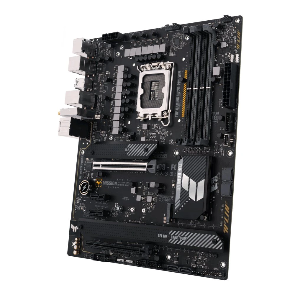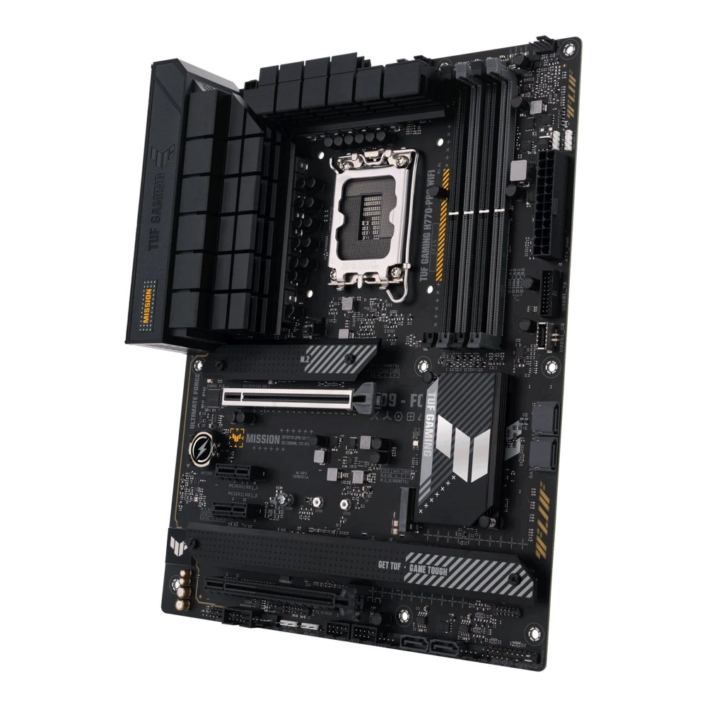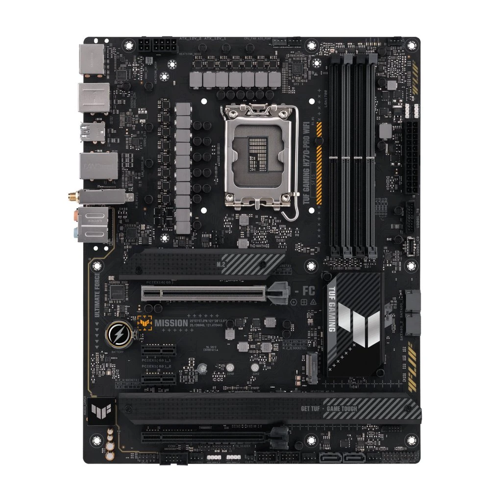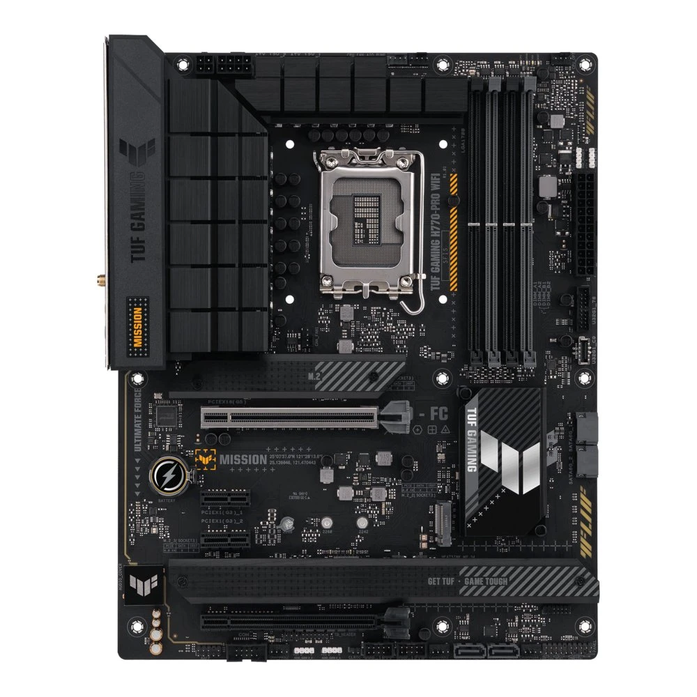 ASUS TUF GAMING H770-PRO WIFI. Processorfabrikant: Intel, Processor socket: LGA 1700, Compatibele processors: Intel® Celeron®, Intel® Core™ i3, Intel® Core™ i5, Intel® Core™ i7, Intel® Core™ i9,…. Ondersteunde geheugen types: DDR5-SDRAM, Maximum intern geheugen: 128 GB, Geheugen slots type: DIMM. Ondersteunde opslagstationinterfaces: M.2, SATA III, Ondersteunde types opslag-drives: HDD & SSD, Soorten RAID: 0, 1, 5, 10. Ethernet interface type: 2.5 Gigabit Ethernet, Wifi-standaard: Wi-Fi 6 (802.11ax), Wi-Fi-standaarden: 802.11a, 802.11b, 802.11g, Wi-Fi 4 (802.11n), Wi-Fi 5 (802.11ac), Wi-Fi 6 (802.11ax). Component voor: PC, Moederbord form factor: ATX, Moederbord chipset familie: Intel