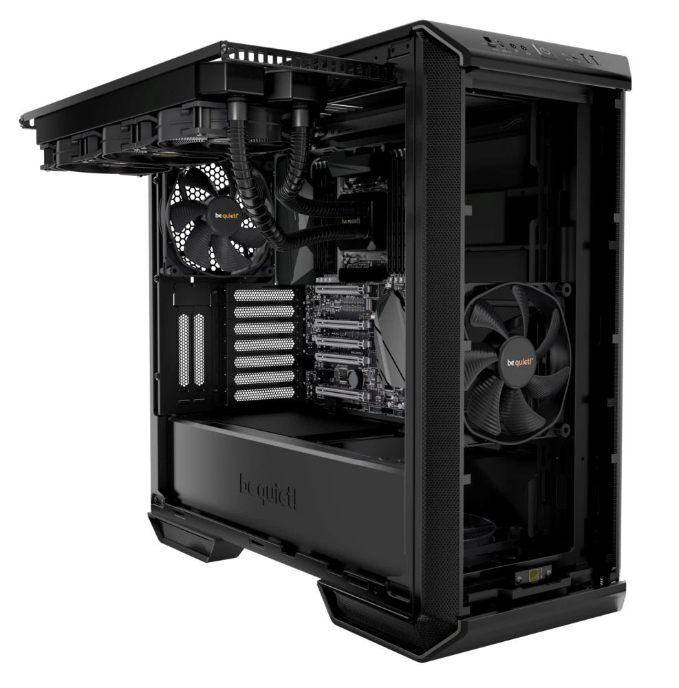 De Dark Base 700 creëert een effectieve luchtstroom met geluidgedempte ventilatieopeningen die kunnen worden opgevoerd door maximaal zeven extra ventilatoren. Er zijn ook drie ruimtes voorzien voor waterkoelers tot 360mm. Een slimme functie is de afneembare bovenste beugel waarop je radiatoren en ventilatoren kunt installeren voordat je ze als een complete eenheid in de kast monteert.