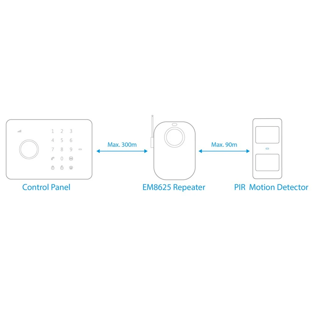 De EM8625 Wireless Repeater is geschikt voor het e-Alarm. Versterk het signaal en vergroot het bereik van de draadloze sensoren. Plaats de repeater maximaal 300 meter (open veld) van het bedieningspaneel. Plaats de accessoires maximaal 90 meter (open veld) van de Wireless Repeater.