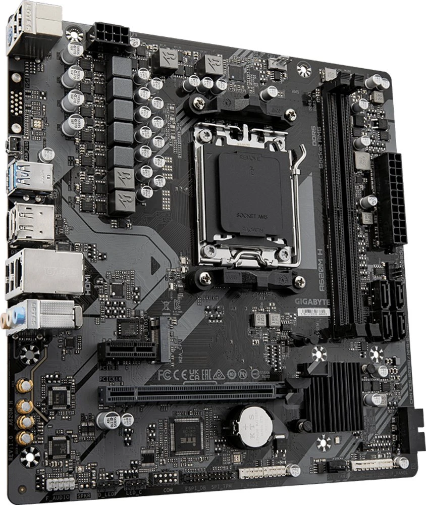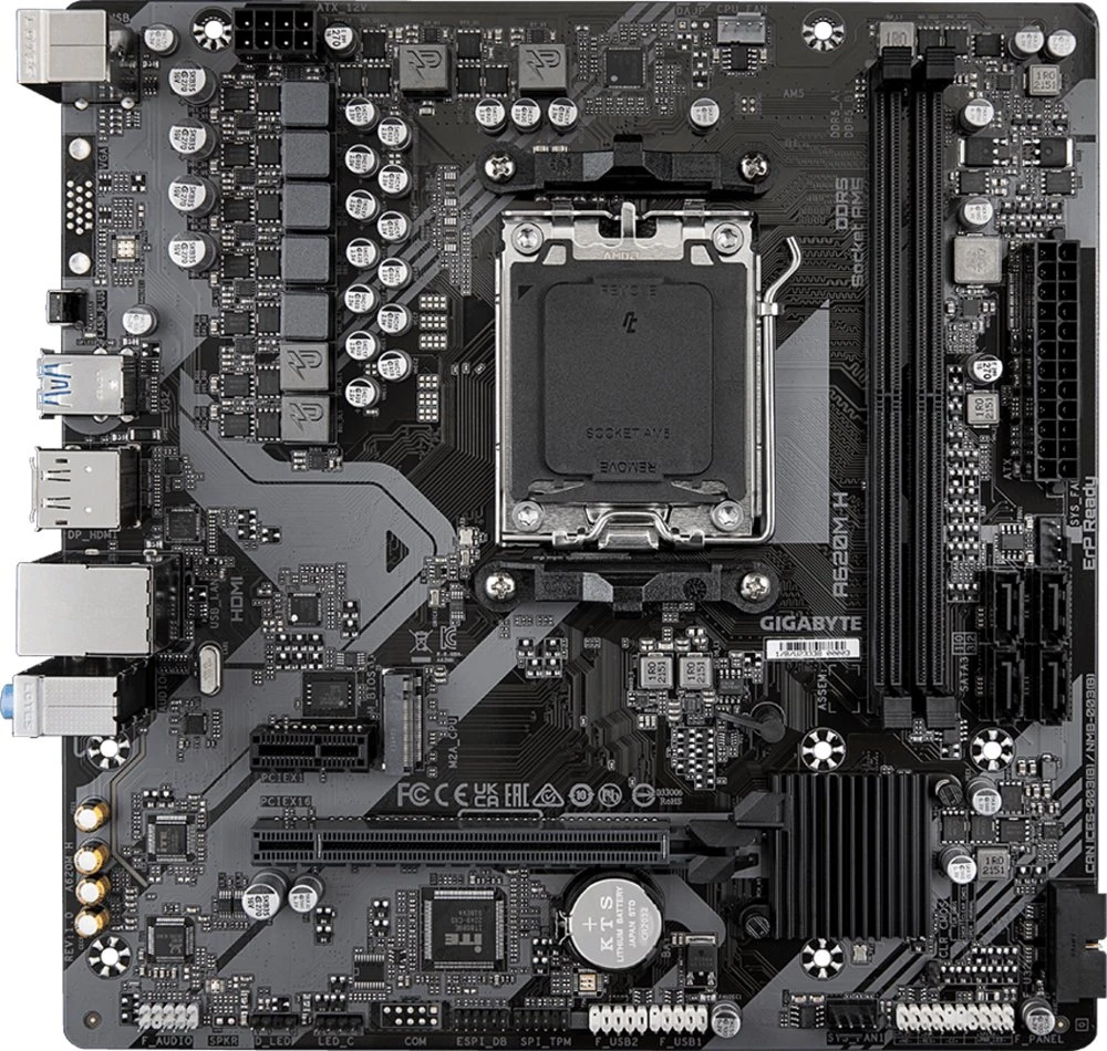 GIGABYTE A620M H. Processorfabrikant: AMD, Processor socket: Socket AM5, Compatibele processors: AMD Ryzen™ 5, AMD Ryzen 7 7th Gen, AMD Ryzen 9 7th Gen. Ondersteunde geheugen types: DDR5-SDRAM, Maximum intern geheugen: 96 GB, Geheugen slots type: DIMM. Ondersteunde opslagstationinterfaces: M.2, SATA III, Ondersteunde types opslag-drives: HDD & SSD, Soorten RAID: 0, 1, 10. Maximum resolutie: 4096 x 2160 Pixels. USB-connectortype: USB Type-A, USB Type-C
