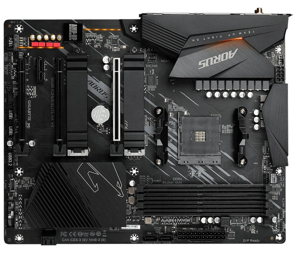 Gigabyte B550 AORUS ELITE AX V2. Processorfabrikant: AMD, Processor socket: Socket AM4, Compatibele processors: 3rd Generation AMD Ryzen™ 3, 3rd Generation AMD Ryzen 5, 3rd Generation AMD Ryzen™ 7, 3rd…. Ondersteunde geheugen types: DDR4-SDRAM, Maximum intern geheugen: 128 GB, Geheugen slots type: DIMM. Ondersteunde opslagstationinterfaces: M.2, SATA III, Ondersteunde types opslag-drives: HDD & SSD, Soorten RAID: 0, 1, 10. Ethernet interface type: 2.5 Gigabit Ethernet, Fast Ethernet, Gigabit Ethernet, Wifi-standaard: Wi-Fi 6 (802.11ax), Wi-Fi-standaarden: 802.11a, 802.11b, 802.11g, Wi-Fi 4 (802.11n), Wi-Fi 5 (802.11ac), Wi-Fi 6 (802.11ax). Component voor: PC, Moederbord form factor: ATX, Moederbord chipset familie: AMD