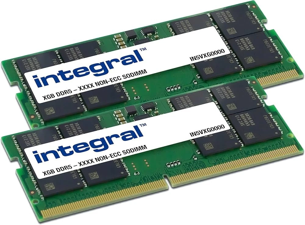 Integral IN5V16GNHRBXK2. Intern geheugen: 32 GB, Geheugenlayout (modules x formaat): 2 x 16 GB, Intern geheugentype: DDR5, Kloksnelheid geheugen: 4800 MHz, Geheugen form factor: 262-pin SO-DIMM, CAS-latentie: 40