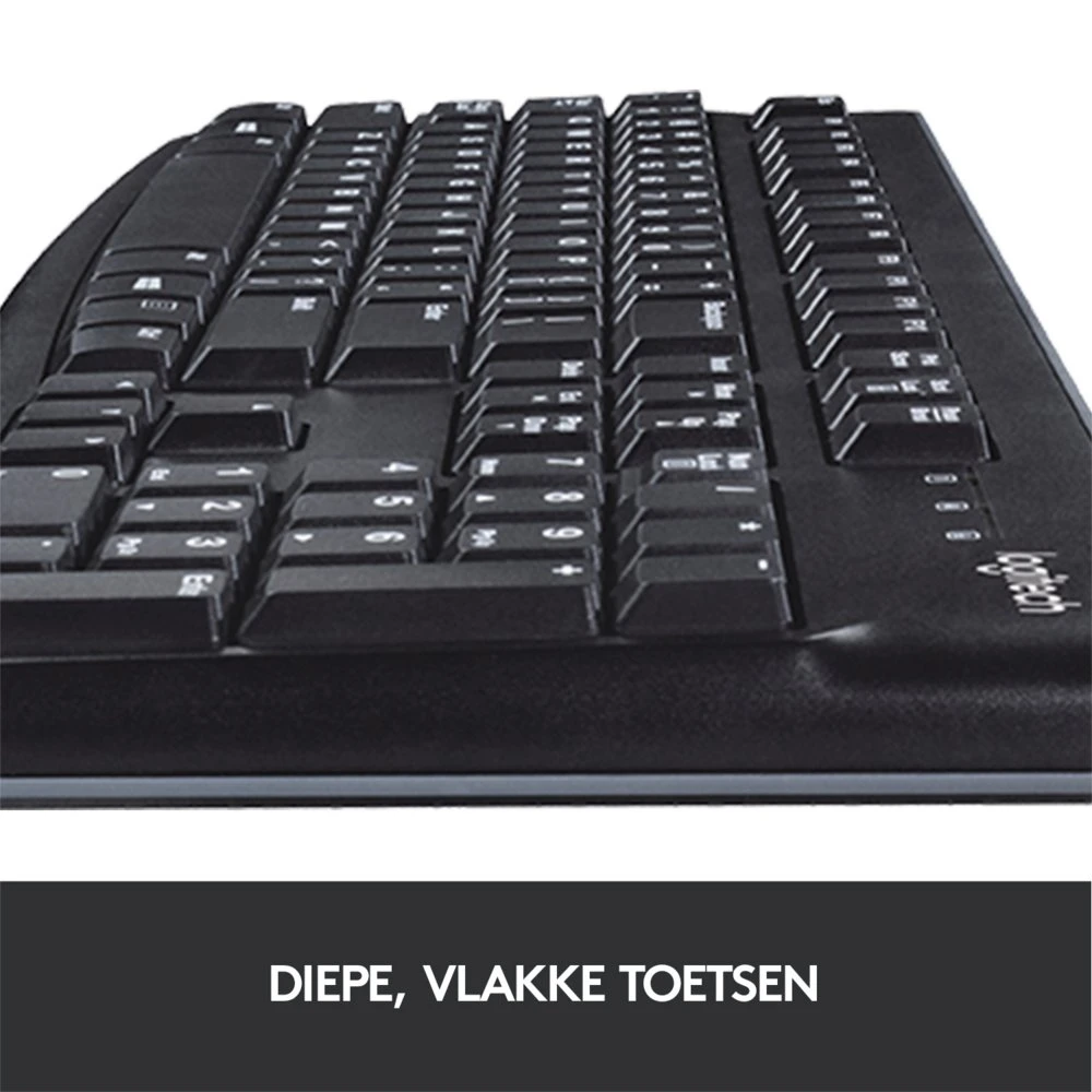Je kunt comfortabel en geruisloos typen dankzij de vlakke toetsen die nauwelijks geluid maken en de standaardindeling met F-toetsen van normaal formaat en een numeriek toetsenblok.