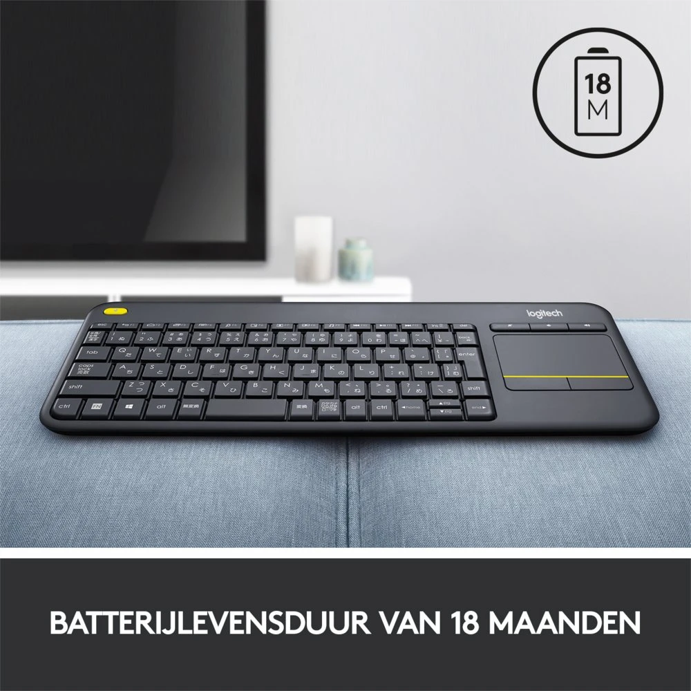 Dankzij het compacte formaat van de Logitech K400 Plus, past deze gemakkelijk op je schoot of op een tafel. Het toetsenbord heeft een QWERTY-indeling met Nederlandse toetsen, waardoor je snel en gemakkelijk kunt typen. Het touchpad heeft ook speciale functies, waaronder scrollen en zoomen, waardoor je snel en efficiënt door pagina’s kunt navigeren.