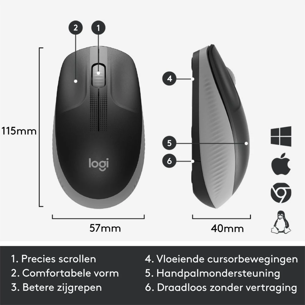 De Logitech M190 is een draadloze muis van groot formaat met een gerond ontwerp dat de natuurlijke boog van middelgrote tot grote handen volgt. De gebogen handpalmondersteuning en speciale concave toetsen voor ideale plaatsing van de vingers bieden comfort de hele dag door. Werk draadloos en beweeg je vrij rond binnen een bereik van 10 meter, vrijwel zonder vertragingen of uitval. Geen kabels betekent een opgeruimd bureau en dankzij de batterijlevensduur van 18 maanden kun je zorgeloos werken; de energiebesparingsmodus wordt automatisch ingeschakeld wanneer je de muis niet gebruikt. Je profiteert van uitstekende navigatie met nauwkeurige tracking en accuraat regel voor regel scrollen tegen een betaalbare prijs.