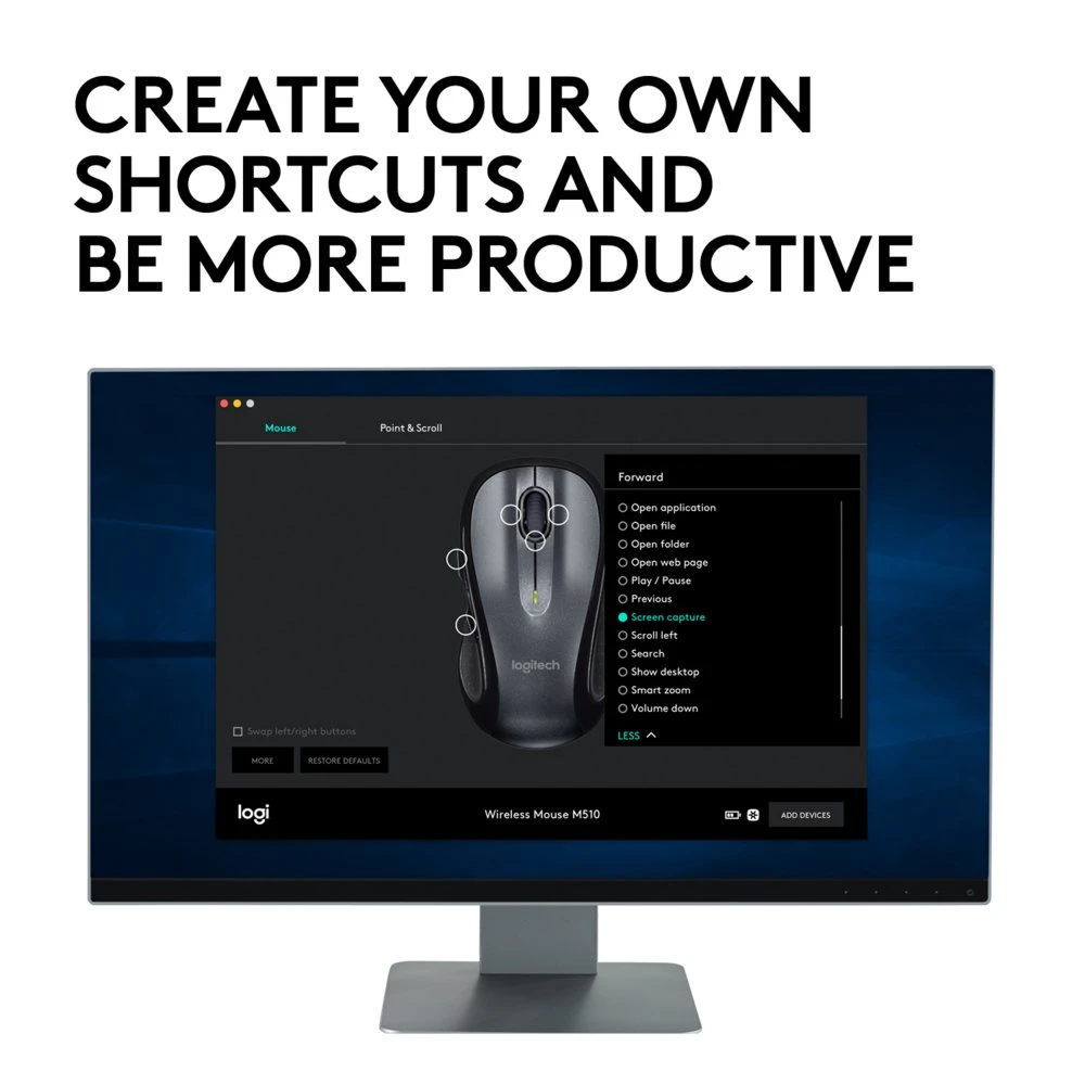 Logitech M510. Bewegingsdetectietechnologie: Laser, Aansluiting: RF Draadloos, Aantal knoppen: 5. Kleur van het product: Zwart