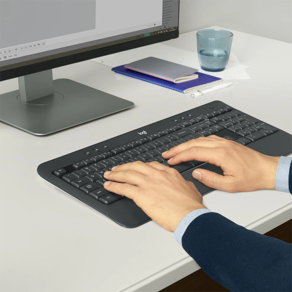 Typ met comfort en precisie op een toetsenbord van normaal formaat. De toetsen zijn geoptimaliseerd voor verbeterde nauwkeurigheid en een stillere toetsaanslag. Dankzij de handsteun en verstelbare voetjes profiteer je van langdurig comfort tijdens het gebruik.