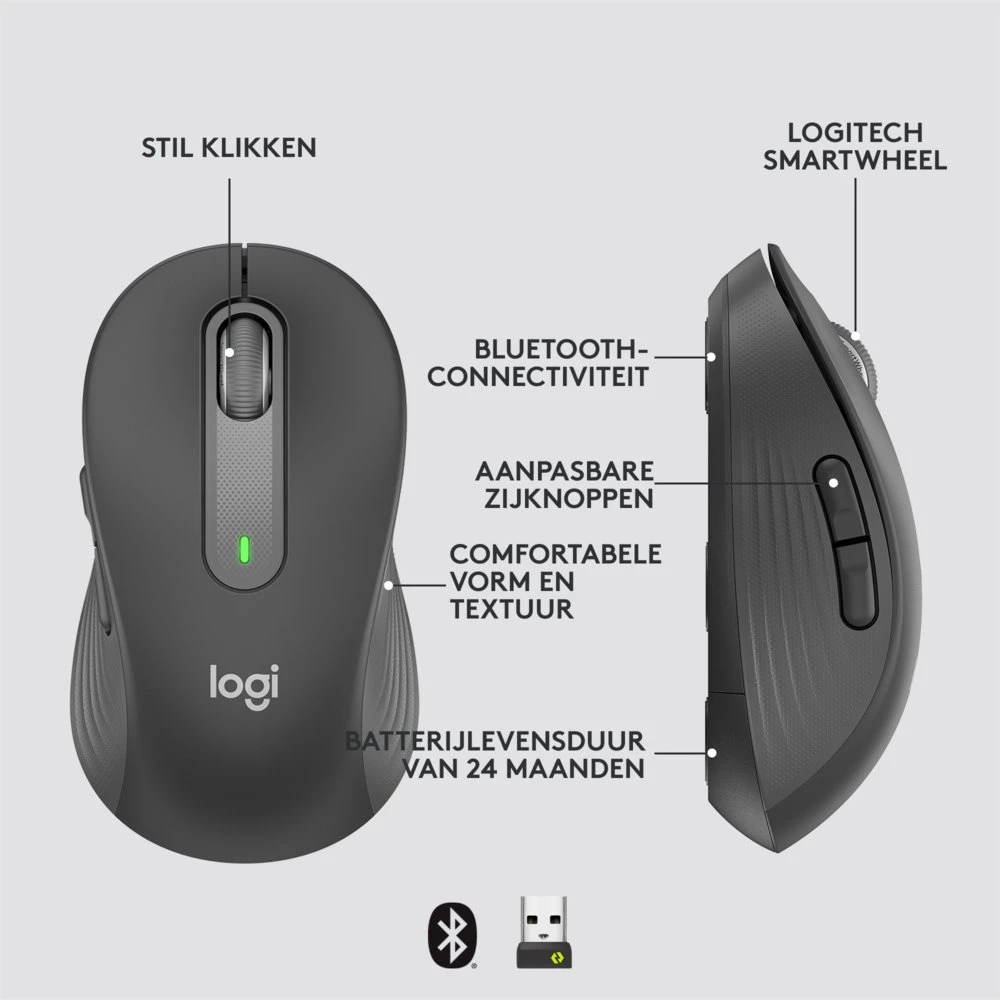 Je gaat genieten van het werken met je Signature M650. De muis heeft een geronde vorm, een zacht duimgedeelte en rubberen zijgrepen om je hand goed op zijn plaats te houden. Zorg voor meer comfort en focus tijdens je werk.