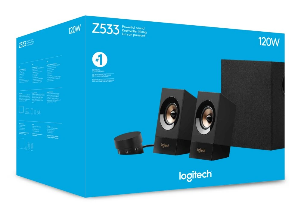 Krachtig geluid dat je raakt. Met 120 watt piekvermogen levert het Logitech® Z533-multimediaspeakersysteem krachtige akoestiek met rijke lage tonen en gedetailleerde hoge tonen voor een robuust, kamervullend geluid. Muziek, films en games worden naar een hoger plan getild dankzij het rijke, dynamische basgeluid dat de naar voren gerichte subwoofer met 2,25” full-range drivers produceert. Regel jouw geluid gemakkelijk via de bedrade bedieningseenheid. Deze bevat niet alleen de belangrijkste speakerknoppen, zoals de aan-uitknop, volumeknop en basregelaar, maar ook de hoofdtelefoonaansluiting en een extra 3,5mm-ingang. Via meerdere ingangen, waaronder 3,5mm- en RCA-ingangen, kun je vrijwel elk apparaat met een audio-uitgang aansluiten, zoals een computer, tablet, smartphone, of zelfs een tv.