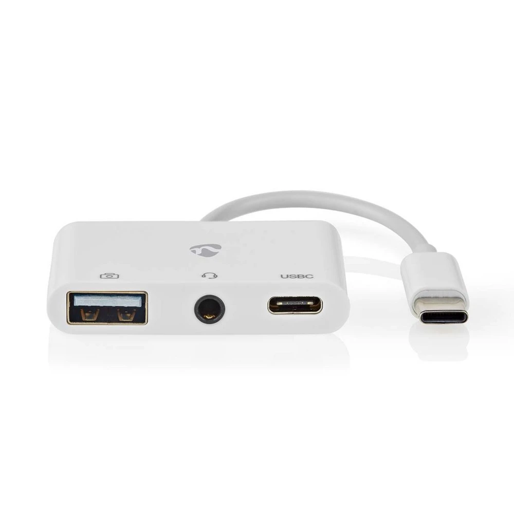 Nedis CCGB64790WT01. Connectiviteitstechnologie: Bedraad, Hostinterface: USB 2.0 Type-C, Type aansluitplug: 3,5 mm. Kleur van het product: Wit, Hub-interfaces: 3.5mm, USB 2.0, USB Type-C, Materiaal behuizing: Polyvinyl chloride (PVC). Aantal per verpakking: 1 stuk(s). Soort kabel: Round cable