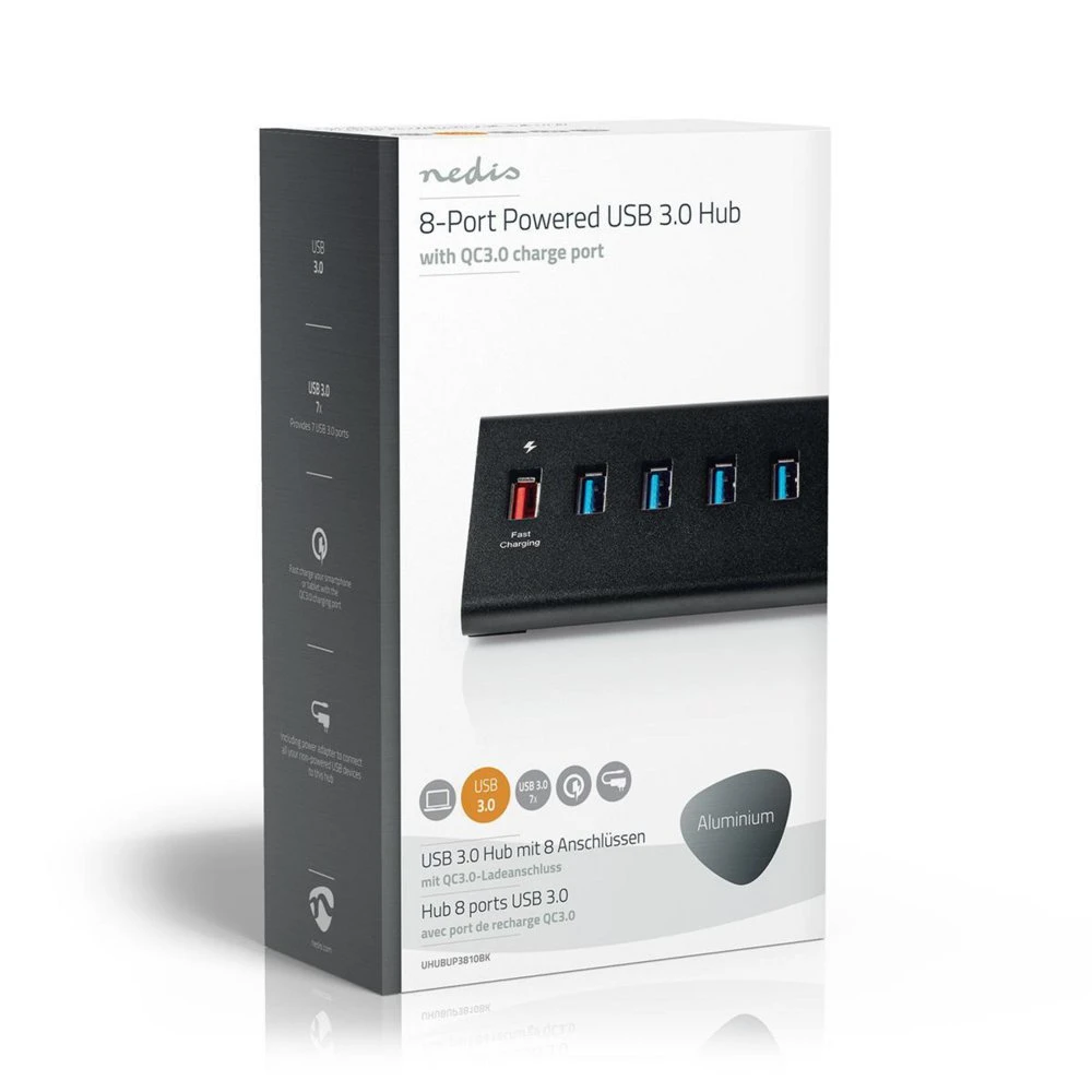 Nedis USB3.0-hub om je desktop-PC of notebook uit te breiden met extra USB-poorten. Hier kun je vervolgens USB-sticks, muizen, printers, netwerkadapters en andere apparaten op aansluiten. De USB-hub is voorzien van een externe voedingsadapter. Hierdoor wordt ook zwaardere randapparatuur ondersteund, zoals 2,5” harde schijven.