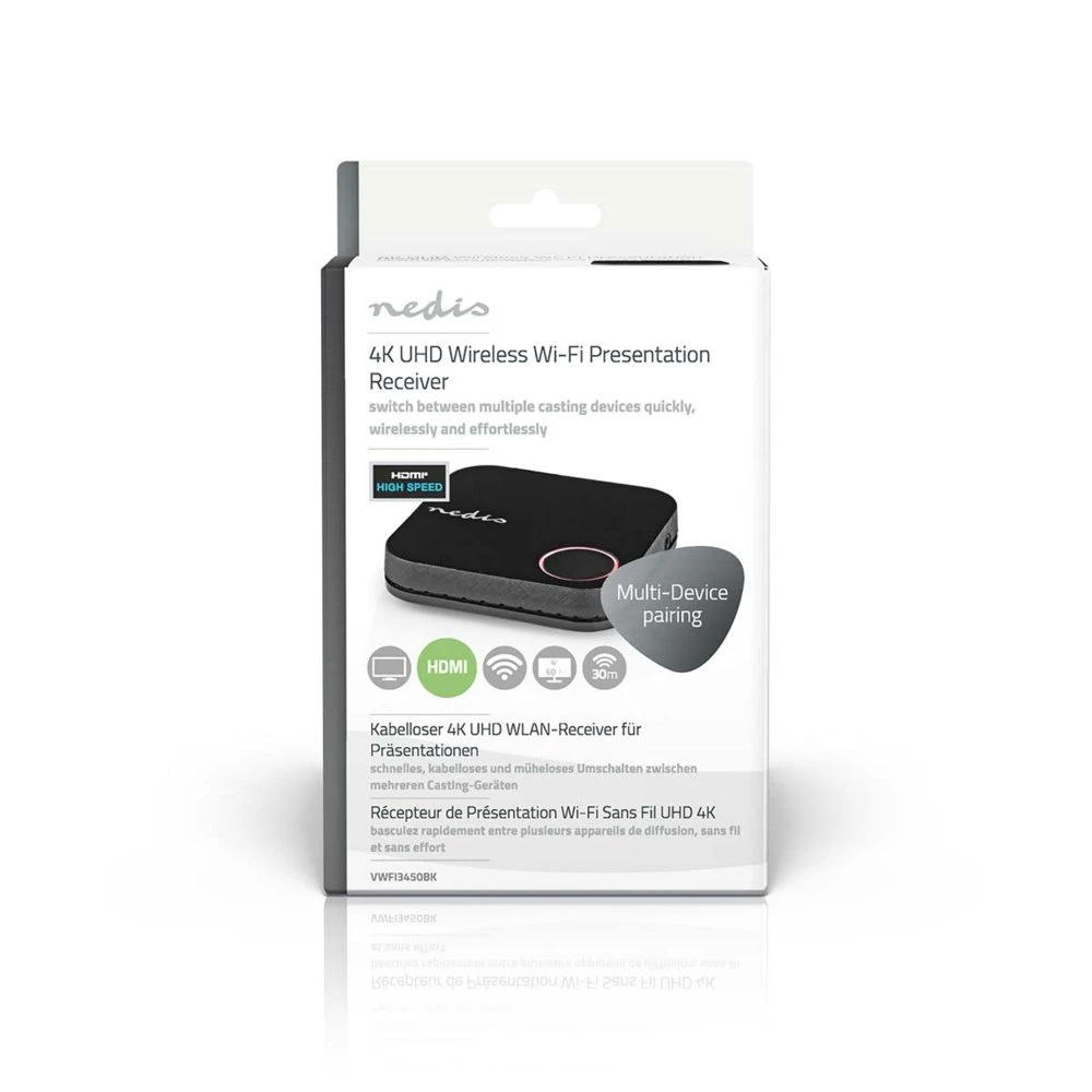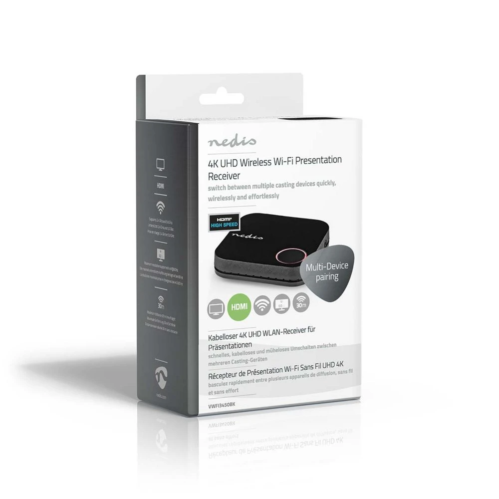 Dit professionele draagbare, draadloze Nedis Wi-Fi-presentatiesysteem ondersteunt draadloze overdracht tot 4K signaal. Hiermee kun je snel, draadloos en moeiteloos tussen meerdere casting-apparaten schakelen. Daarom is dit een ideale oplossing voor zogenaamde Bring Your Own Device (BYOD)-vergaderingen.