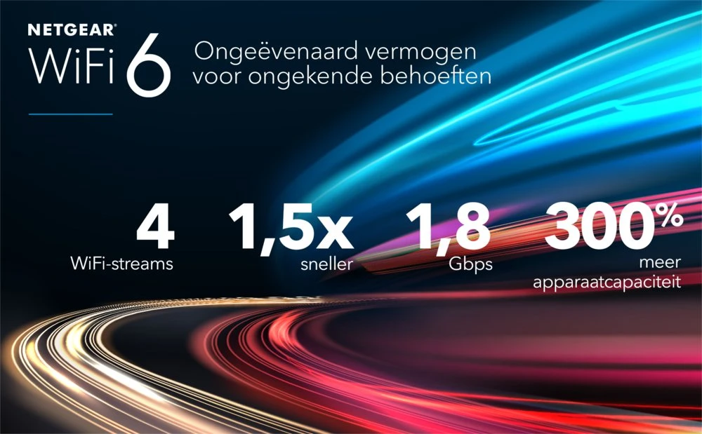 Geniet van een grotere capaciteit en consistente, krachtige WiFi op al jouw aangesloten apparaten met WiFi 6. Ervaar een nieuw niveau van WiFi-snelheid en connectiviteit, zodat je sneller en zonder onderbrekingen verbinding kunt maken, streamen en downloaden.