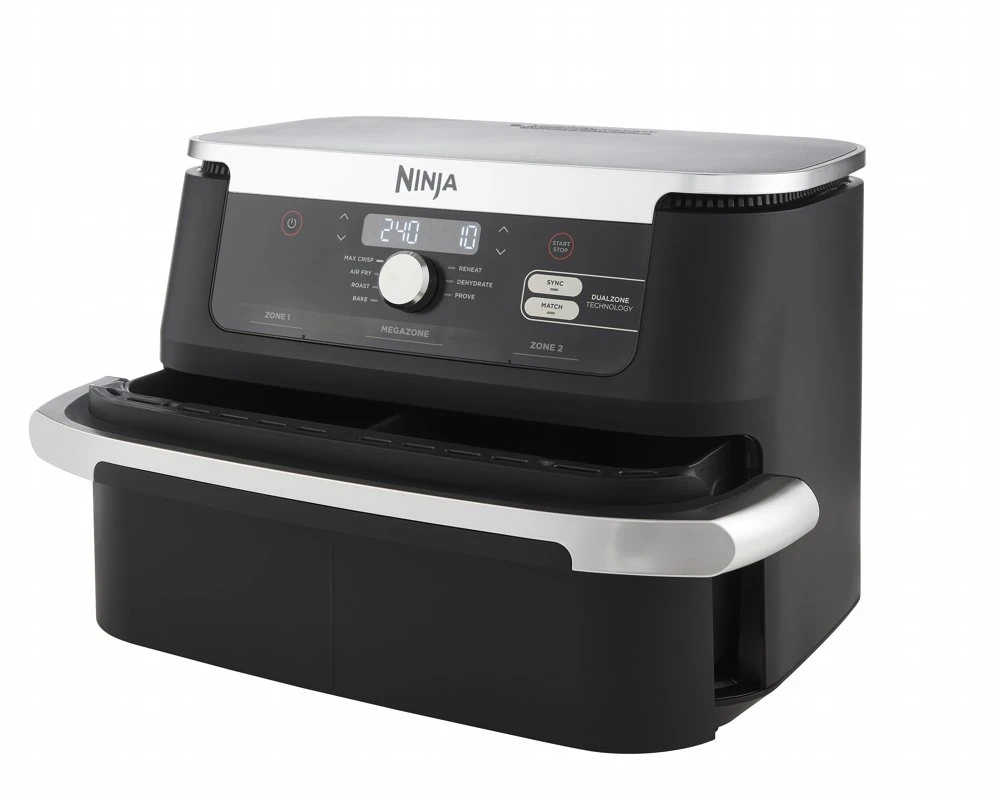 De Ninja AF500EU Airfryer is een uitzonderlijk ruime en veelzijdige heteluchtfriteuse met een inhoud van maar liefst 10,4 liter en een vermogen van 2470 watt, waarmee hij moeiteloos grote hoeveelheden voedsel bereidt voor het hele gezin of een gezelschap. Dit vrijstaande model is voorzien van twee afzonderlijke manden die samen voor maximale flexibiliteit zorgen. Je kunt hiermee gemakkelijk verschillende gerechten tegelijk klaarmaken, ieder met een eigen kooktijd en temperatuur, of de manden juist synchroniseren zodat alles gelijktijdig gereed is. Dankzij de royale capaciteit en slimme indeling is er ruimte voor bijvoorbeeld twee complete kippen of een grote hoeveelheid friet en bijgerechten in één keer.