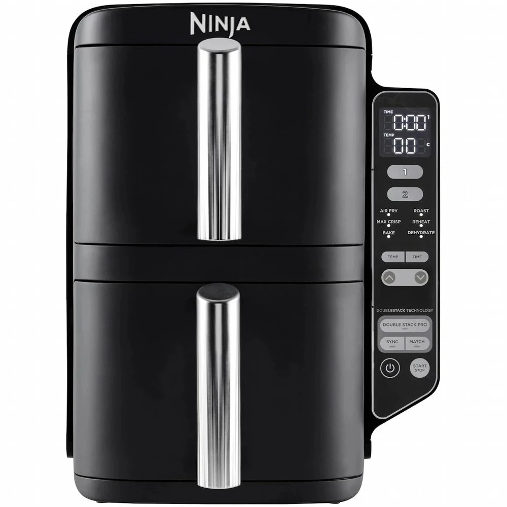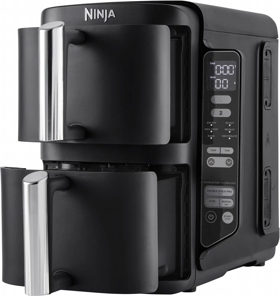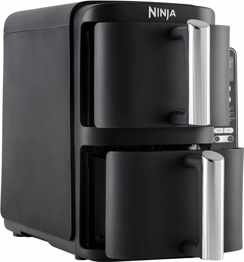 De Ninja SL300EU Double Stack Airfryer in elegant zwart is de ideale keukenhulp voor iedereen die gezond en snel wil koken zonder in te leveren op smaak of gemak. Met een royale inhoud van 7,6 liter verdeeld over twee gestapelde manden van elk 3,8 liter bereid je moeiteloos een maaltijd voor het hele gezin. Je kunt er een complete kip van 1,2 kilo in garen of 400 gram friet per mand knapperig bakken, ideaal voor zowel dagelijkse maaltijden als etentjes met vrienden.