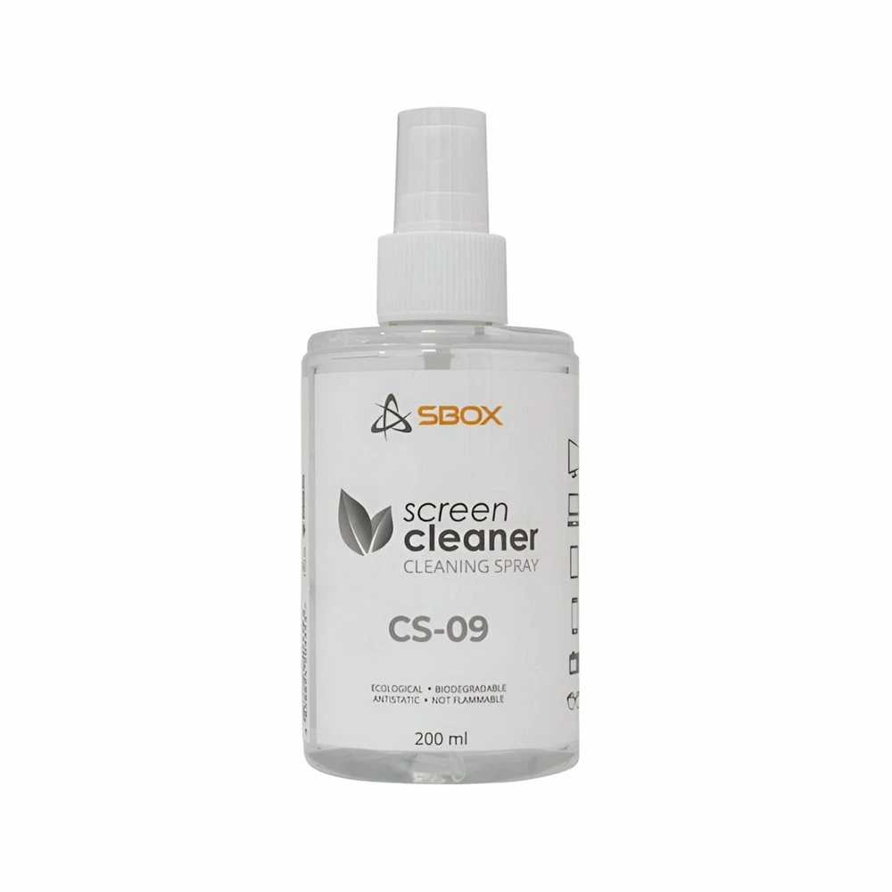 De SBOX CS-09 Schermreiniger Spray (200 ml) reinigt veilig en streeploos schermen van laptops, monitors, smartphones en tablets. Verwijdert stof, vingerafdrukken en vet zonder het oppervlak te beschadigen. Geschikt voor dagelijks gebruik.