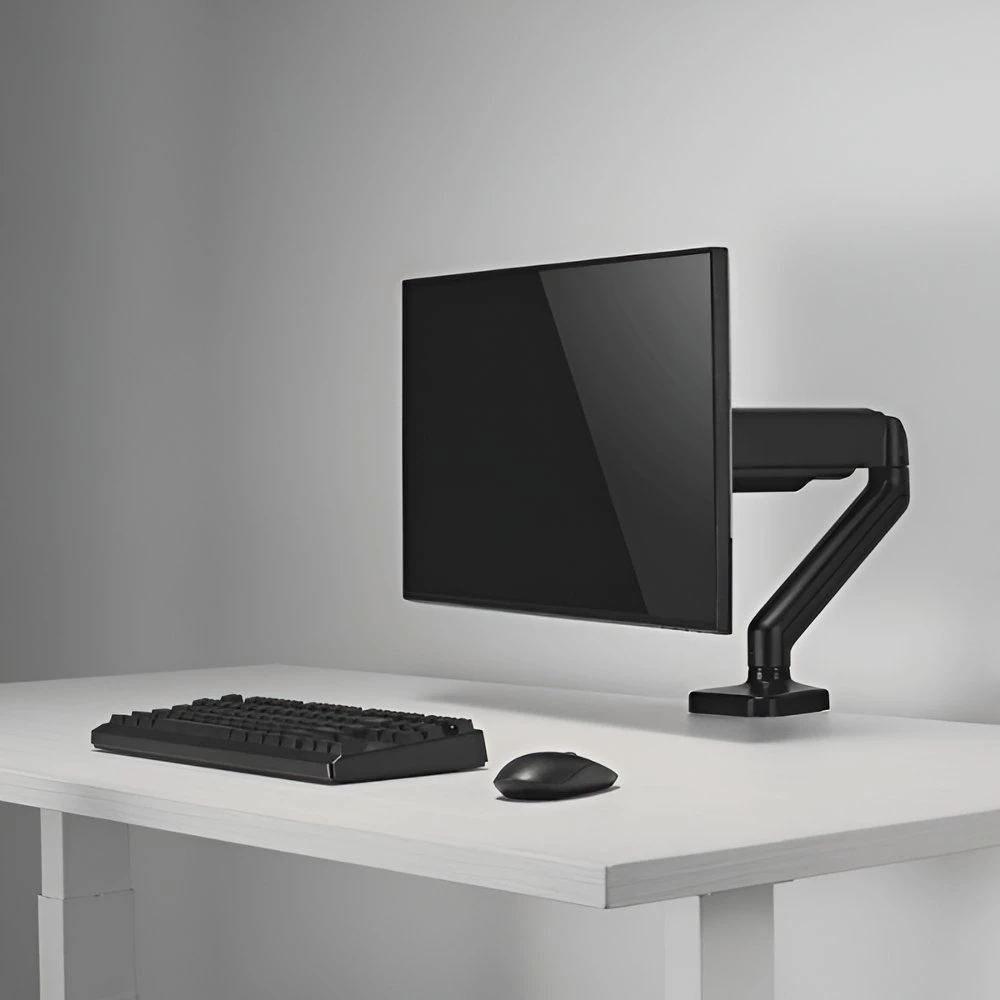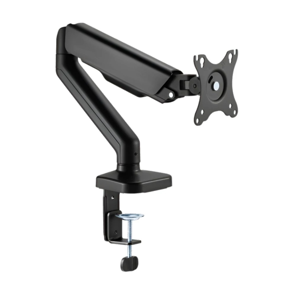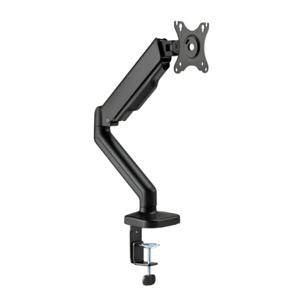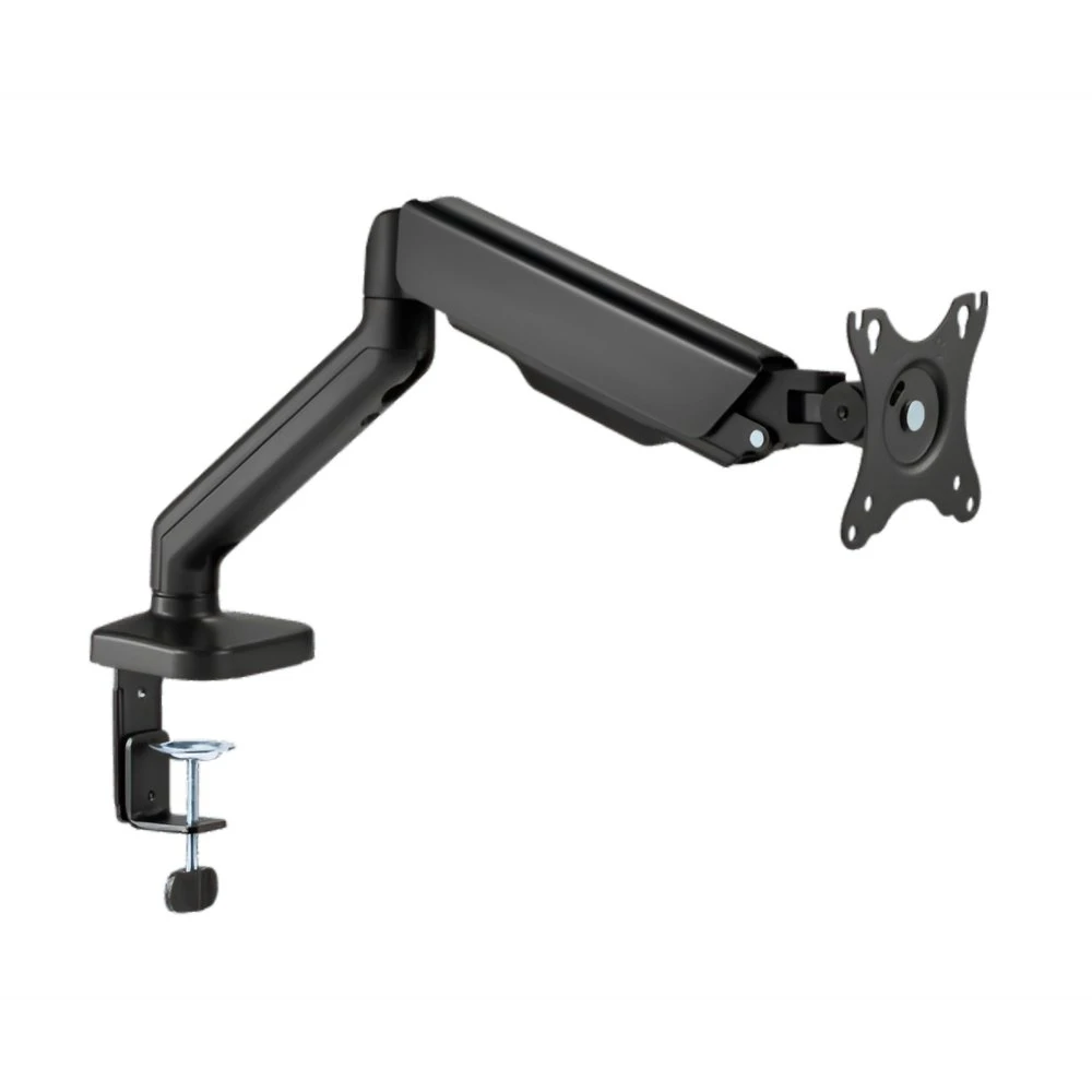 Gemaakt van duurzaam staal en kunststof met een zwarte poedercoating, biedt de beugel een moderne uitstraling die past in elke werkomgeving. De armen zijn volledig verstelbaar, met een kantelbereik van +90° tot -90°, een draaibereik van +90° tot -90°, en een rotatiecapaciteit van +180° tot -180°, waardoor je de monitor eenvoudig kunt aanpassen aan je ideale kijkhoek. De hoogte van de centrale paal is 480 mm, en de arm heeft een bereik van 117 mm, wat flexibiliteit biedt in de positionering van je monitor.