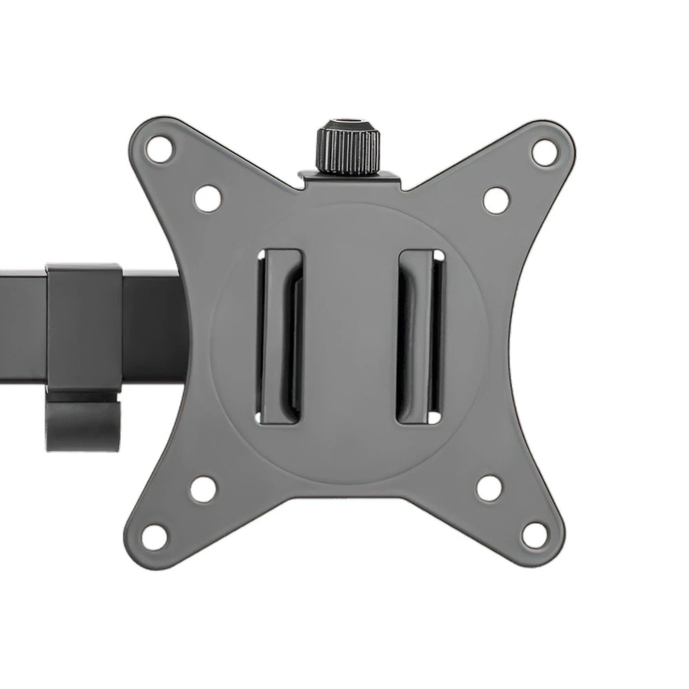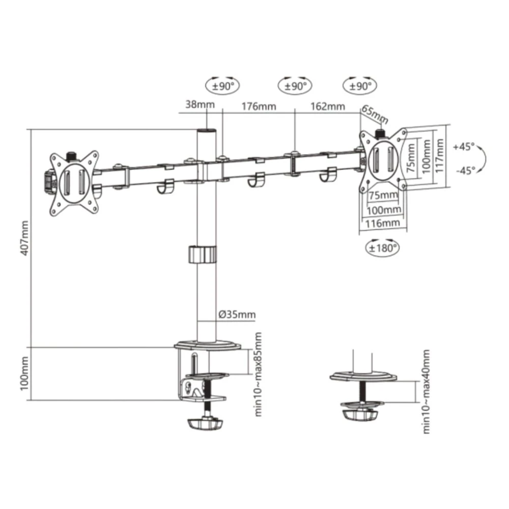 De beugel is vervaardigd uit duurzaam staal en kunststof met een zwarte poedercoating, wat zorgt voor een moderne uitstraling die past in elke werkomgeving. De armen zijn volledig verstelbaar, met een kantelbereik van +45° tot -45°, een draaibereik van +90° tot -90°, en een rotatiecapaciteit van +180° tot -180°, waardoor je de schermen eenvoudig kunt aanpassen aan je ideale kijkhoek. De hoogte van de centrale paal is 407 mm, en de armen hebben een bereik van 376 mm, wat flexibiliteit biedt in de positionering van je monitoren.