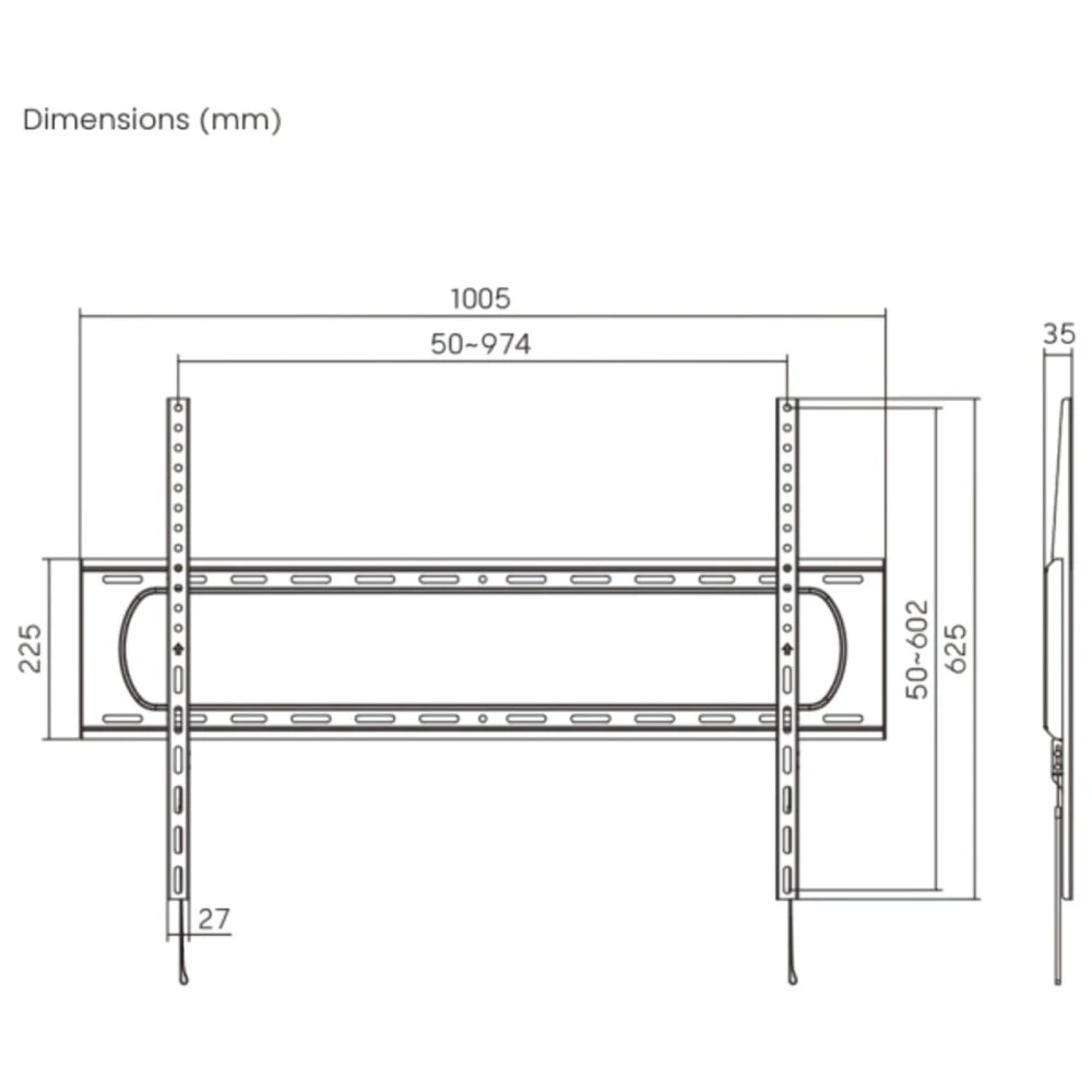 De afneembare VESA-plaat maakt de installatie eenvoudig en snel. De geïntegreerde waterpas helpt bij het nauwkeurig uitlijnen van de tv tijdens de montage. Met afmetingen van 35×1005×625 mm biedt deze beugel een solide en discrete oplossing voor het ophangen van grote televisies.