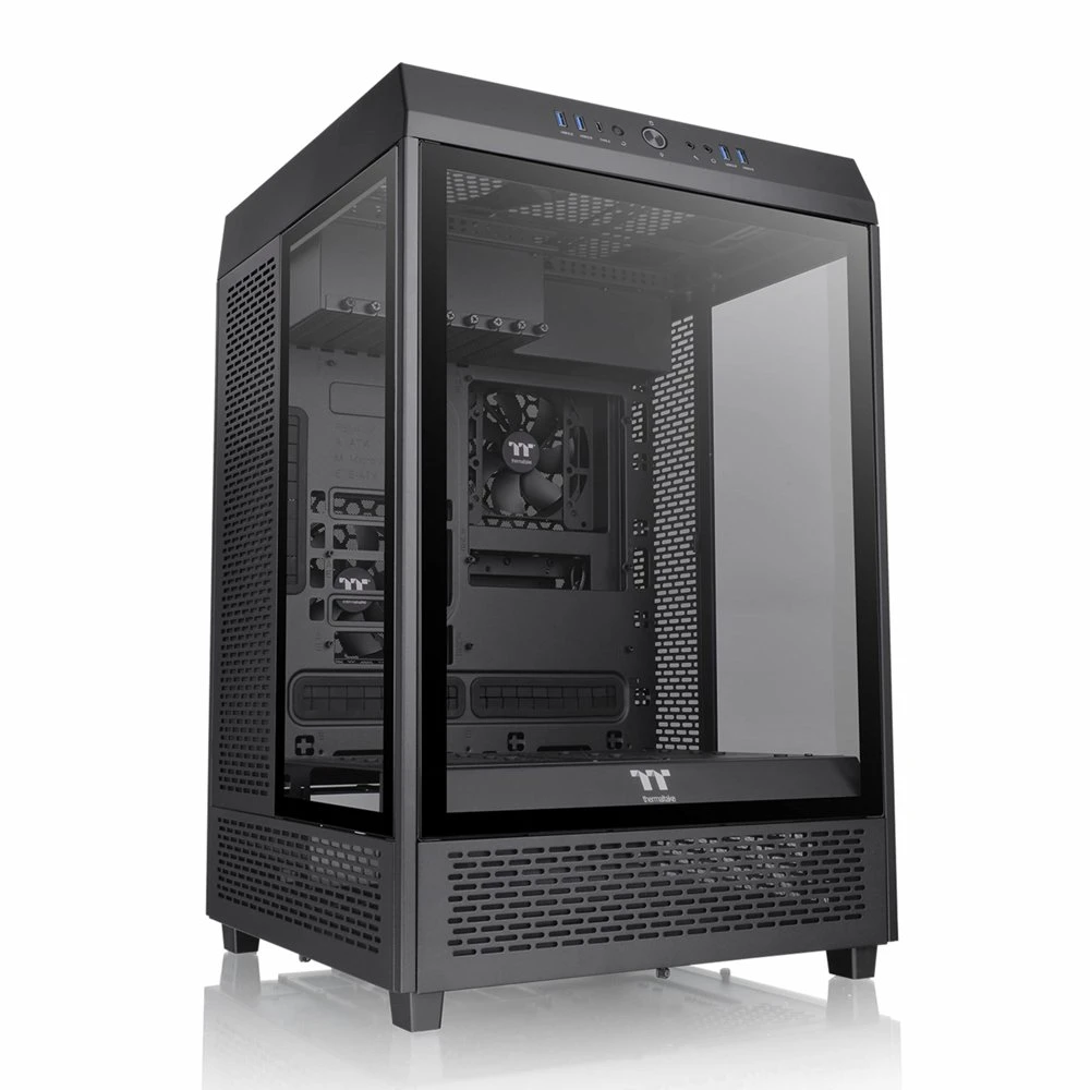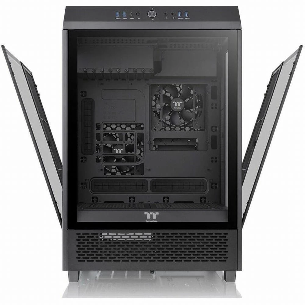 De Thermaltake The Tower 500 is een mid tower behuizing die zich onderscheidt door zijn verticale ontwerp en drie glazen panelen, waarmee je een panoramisch zicht krijgt op je hardware. Dit ontwerp is niet alleen een lust voor het oog, maar zorgt ook voor een natuurlijke luchtstroom die de warmte efficiënt afvoert. De behuizing ondersteunt moederborden tot E-ATX en biedt ruimte voor krachtige grafische kaarten en uitgebreide waterkoelingsoplossingen. Dankzij de mogelijkheid om een 360 mm radiator en meerdere ventilatoren te plaatsen, is de Tower 500 ideaal voor high-end systemen met hoge koelvereisten.