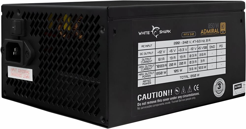 De voeding ondersteunt automatische spanningsomschakeling tussen 100 en 240 volt en levert stabiele prestaties met een hoog rendement. Daarnaast biedt hij uitgebreide beveiliging tegen overspanning, overstroom, kortsluiting en oververhitting, zodat je hardware altijd veilig is. Of je nu een krachtige game-pc bouwt of een professioneel systeem met veeleisende componenten, de White Shark Admiral 850W levert betrouwbare prestaties en is klaar voor toekomstige upgrades.