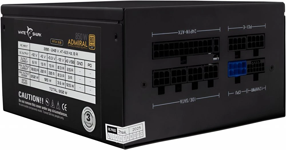 De White Shark Admiral met 850 watt vermogen is een krachtige en betrouwbare voeding, perfect geschikt voor moderne gaming-pc’s en professionele werkstations. Deze voeding voldoet aan de nieuwste ATX 3.0-standaard, waardoor hij volledig is voorbereid op de zwaarste eisen van de nieuwste generatie componenten. Dankzij ondersteuning voor PCI-e 5.0 en de aanwezigheid van een 12VHPWR-connector is deze voeding uitermate geschikt voor high-end grafische kaarten zoals die uit de NVIDIA GeForce RTX 5000-serie.