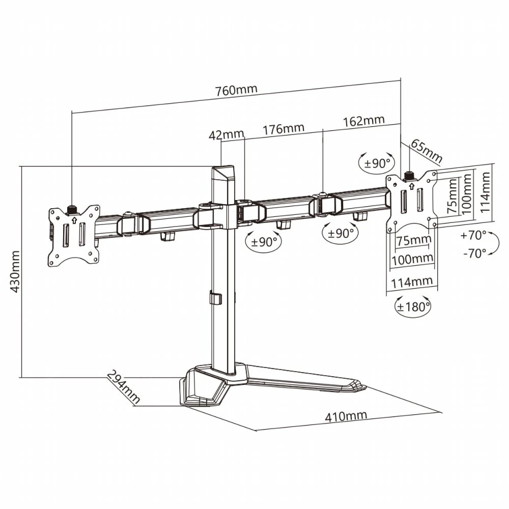 De TUTANKHAMUN is uitgerust met een VESA-montagebeugel die compatibel is met VESA 75×75 mm en 100×100 mm, waardoor deze geschikt is voor een breed scala aan monitoren. De armen zijn volledig verstelbaar, met een kantelhoek van +90° tot -90°, een rotatie van +180° tot -180° en een zwenkbereik van +90° tot -90°. Dit stelt gebruikers in staat om hun monitoren in de gewenste positie te plaatsen voor optimaal comfort en productiviteit.