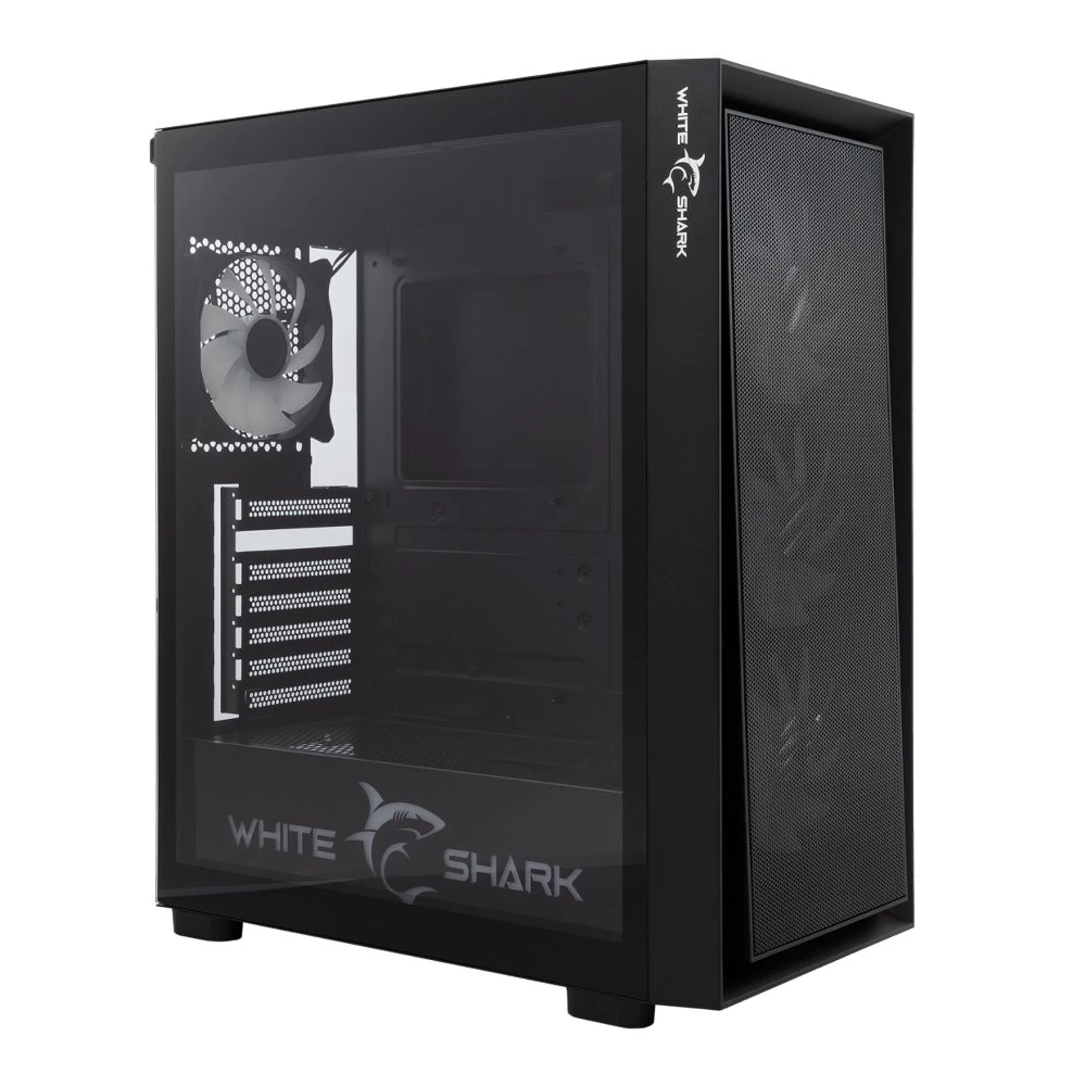 De White Shark WARHEAD is een robuuste en stijlvolle midi tower behuizing, ontworpen voor gamers en pc-bouwers die op zoek zijn naar een betrouwbare en visueel aantrekkelijke behuizing. Met zijn strakke zwarte ontwerp en vier vooraf geïnstalleerde 120 mm RGB-ventilatoren biedt deze behuizing niet alleen uitstekende koeling, maar ook een indrukwekkende visuele presentatie.