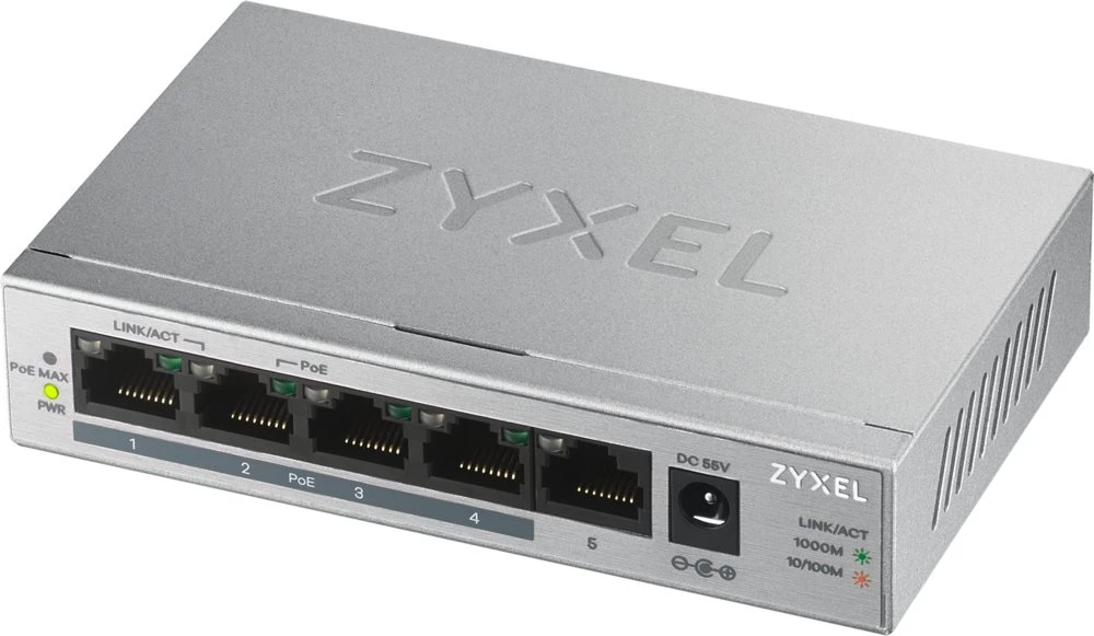 De Zyxel GS1005HP is een 5-poorts gigabit switch met 4 x PoE+ en een PoE-budget van 60 watt. Deze onbeheerde switch is de perfecte keuze voor kleine of externe kantoren die gebruikmaken van IP-camera’s, VoIP-telefoonsystemen of draadloze toegangspunten.